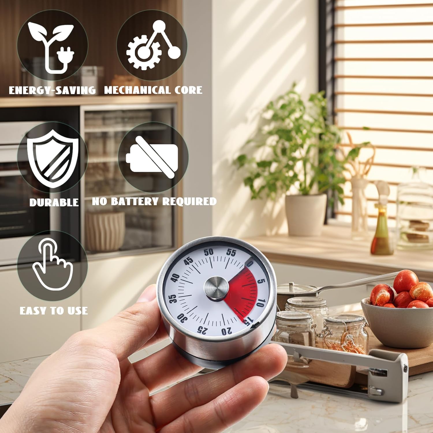 The cooking timer is powered by manual winding, so there's no need for batteries! The kitchen timer has a long battery life, so you won't have to worry about replacing them often. Say goodbye to high-frequency battery replacements and stop wasting valuable time and money buying extra batteries! The mechanical kitchen timer is convenient and fun!